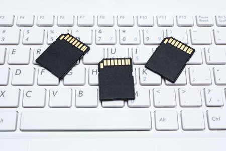 computer keyboard and several sd card, the concept of data storage.