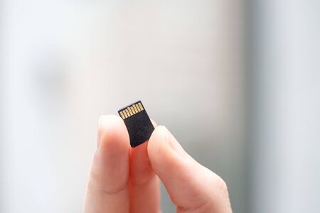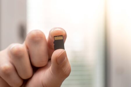 Male hand holding Micro SD card.