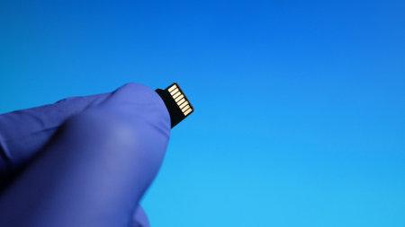 Micro SD memory card in hand close-up on blue background.