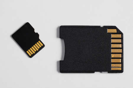 Micro SD memory card with adapter on white background close up