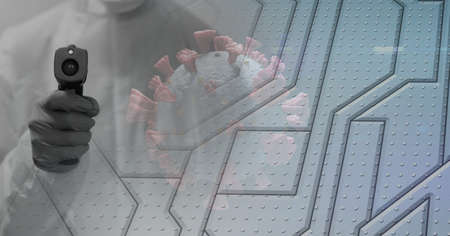 Digital illustration of macro Covid-19 cell with data, statistics and numbers floating over scientist wearing protective clothes, using tablet. Coronavirus Covid-19 pandemic concept digital composite