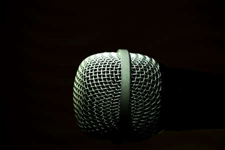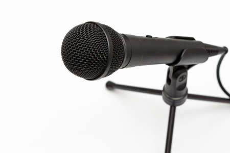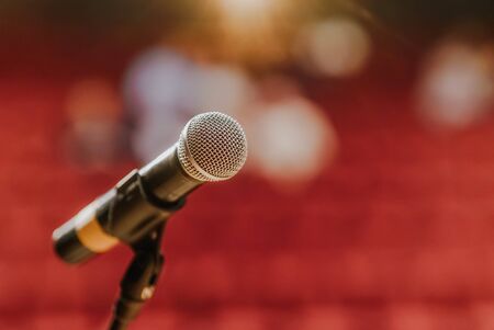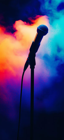 Mic on a stage. Microphone standing on an empty stage with colorful light and smoke