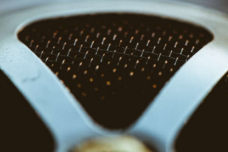 Auto part with shiny mesh. Metallic texture of grid close-up. Triangular shape of grid with gold reflex.