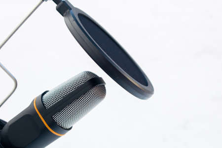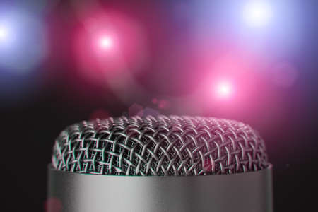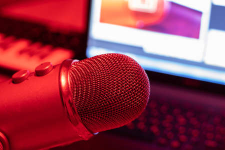 Professional studio condenser microphone on a background of a laptop screen and a music keyboard in red lighting.