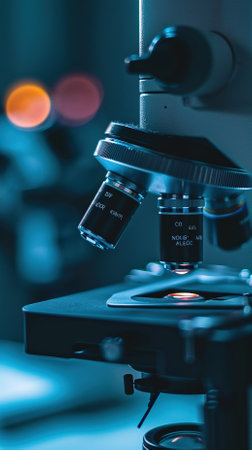 Closeup of microscope with metal lens, data analysis in the laboratory, scientific equipment in biology, chemistry, medical for scientists or student in education