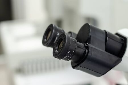 Close-up of scientific microscope. Laboratory in hospital. Epidemic disease, healthcare, vaccine research and coronavirus covid-19 test.