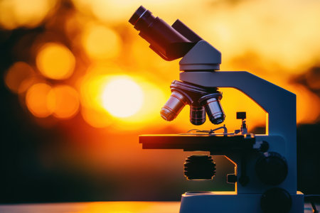 A microscope is positioned prominently with a striking sunset casting warm colors in the background.