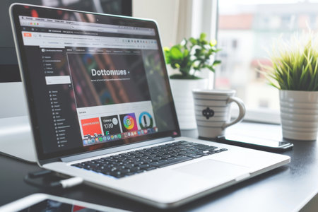 A laptop is placed on a desk next to a phone and a plant, Designing engaging social media graphics