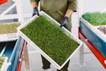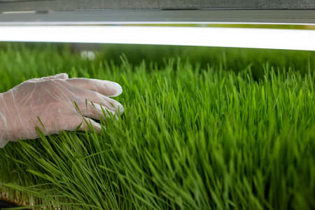 Rich harvest of fresh juicy sprouted wheat was grown in greenhouse for vegetarians and adherents of healthy lifestyle and nutrition. Bright green wheat grown by employees of farm of useful microgreens