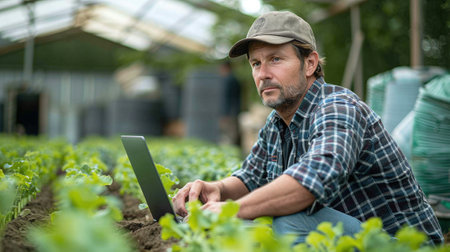 A farmer uses a tablet in the field, analyzing crop data against the backdrop of growing plants.