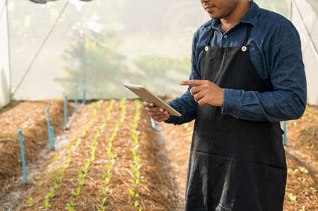 Smart farm, Farmer using tablet computer control agricultural system in greenhouse before harvest.