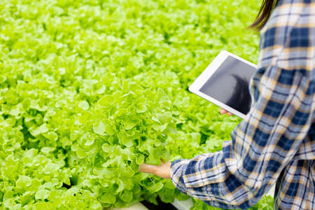 Young woman analyze and study research on organic vegetable plots, hydroponic in concept organic vegetables for health food.
