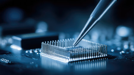 This close-up image showcases a precision tool delicately manipulating a microchip on a circuit board, highlighting the intricate details of modern electronics and technology.