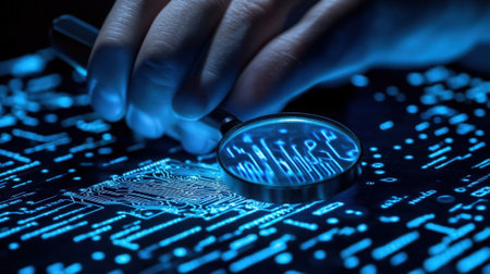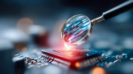 Magnifying glass hovering over electronic circuit board, symbolizing technology, precision, research, and digital innovation.
