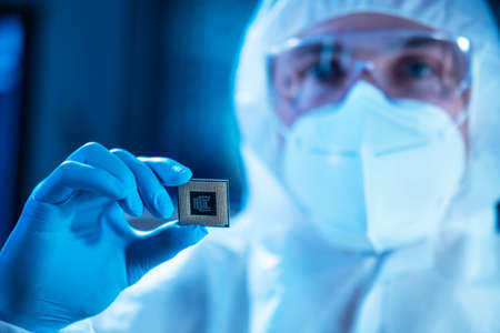 An engineer working in a laboratory wearing a special uniform and protective gloves holds new processor in hands and examines it