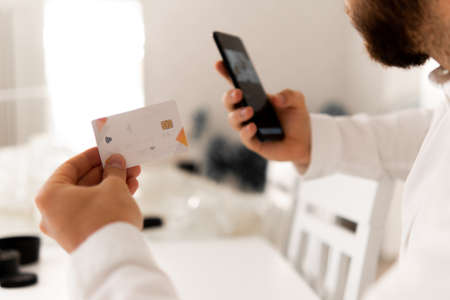 A man holding a smartphone and credit card. He fills his credit card information with a smartphone to pay for the goods ordered on the website, credit cards can pay for goods and services online.