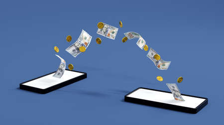 Mobile banking concept, coin and dollar banknote moving from smartphone to other cellphone, online money transfer e-wallet, 3D rendering.