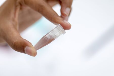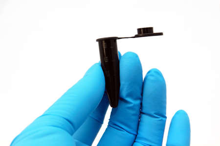 Micro Centrifuge tube with blood sample in solution handle in scientist hand wear surgical gloves, with tips micropipette and purple eppendorf racks, biotechnology analysis experiment for anti-virus.