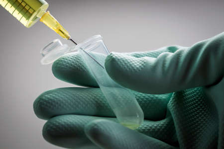 Scientist with green latex gloves manipulates vial and syringe in laboratory, conceptual image