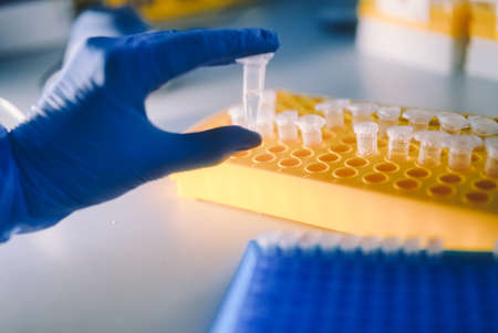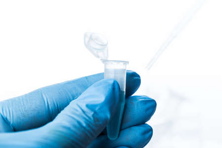 Scientist working with a pipette and a flask, in plastic tubes for DNA studies. Concept of science, laboratory and study of diseases.