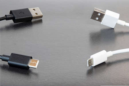 USB charging cables for smartphones and tablets in white and black on a dark background. An irreplaceable thing for modern electronics.