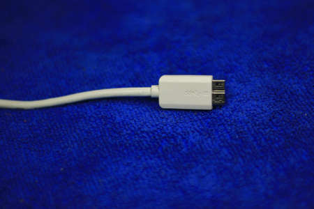 Studio lighting. usb wire for connecting to a computer in blue or purple on a wooden white background in retro style. Close-up.