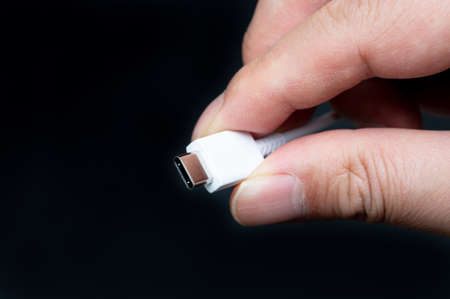 Hand holding black micro USB cable. Man's hand holds a USB Connector. Closeup man hand holding USB cable.Selective focus and shallow Depth of field.