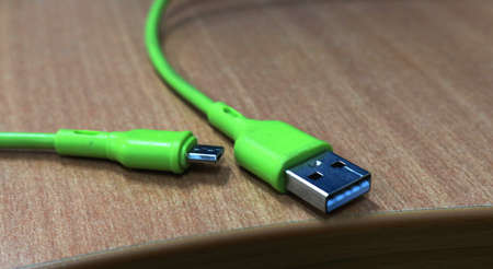 Green USB cable on a wooden table close-up. High quality photo