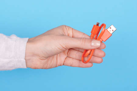 Hand showing USB cable on white surface. Perfect for technology, connection, charging, gadgets and digital communication concepts.