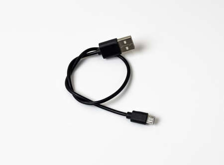 Black usb cord for transferring digital data on a white background. Digital data transmission technologies. Computer connection. Charging mobile devices. USB cord for charging the phone.