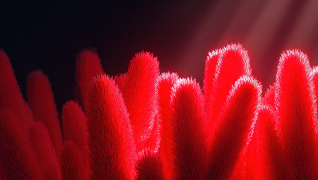 Red, fuzzy, cylindrical structures bathed in light against a dark, ethereal backdrop