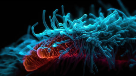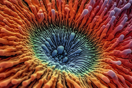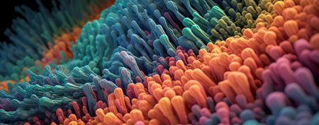 This vibrant image captures microscopic microbial structures showcasing colorful and intricate details. Perfect for scientific, educational, and research-focused projects.