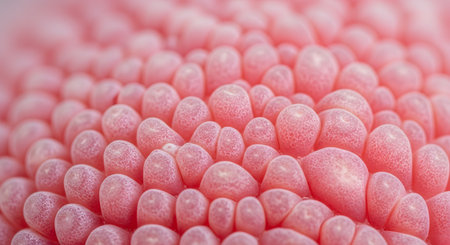 A macro photograph capturing a close-up of pink, round, and spiky objects. The objects are arranged in a scattered pattern, creating an abstract and textured surface.