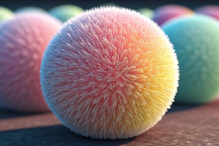 Close up of many pink balls arranged in a pattern. Concept of softness and warmth, as the pink balls are fluffy and appear to be made of cotton