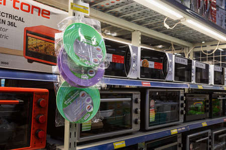 March 23, 2021 Balti Moldova supermarket or wholesale hypermarket. Department of goods for the kitchen. Illustrative editorial. Showcase with microwave ovens.