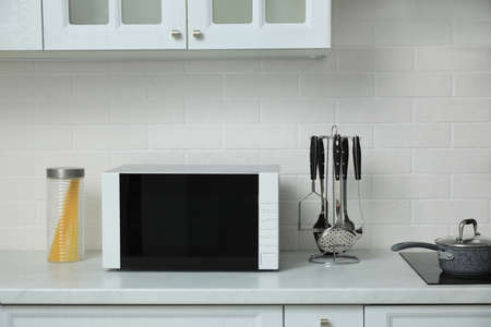 Closed microwave oven with timer standing on shelf. modern kitchen appliances. Cooking food at home. defrosting equipment. modern technology
