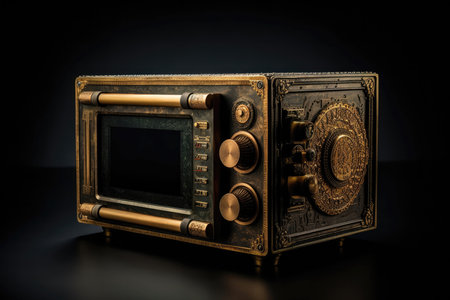 Gold Steampunk Microwave Oven On Black Smoky Background