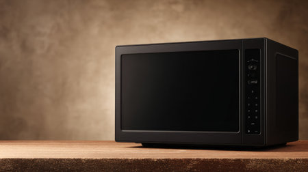 A sleek black microwave oven sits on a wooden table, showcasing its modern design against a warm textured background, ideal for kitchen or appliance concepts.