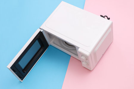 Microwave oven with an open door on a blue-pink pastel background. top view