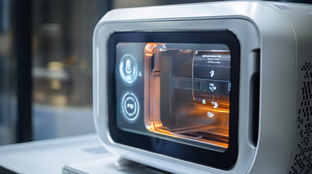 A close-up shot of a modern kitchen appliance control panel, showcasing its sleek digital display and buttons for temperature and timer settings, perfect for contemporary cooking environments.