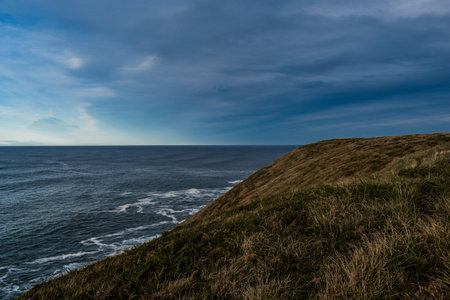 Grassy cliff in front of the sea on a cloudy day.