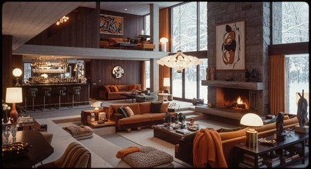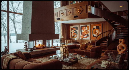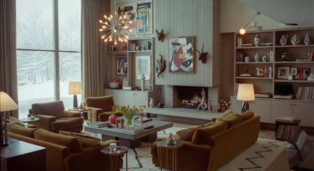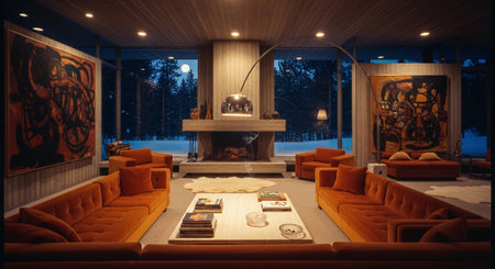 A stylish mid-century modern living room with large windows, featuring orange and yellow furniture, a cozy fireplace, and winter scenery outside