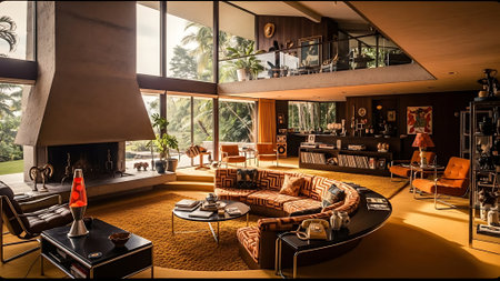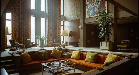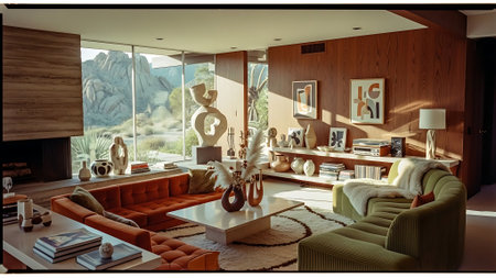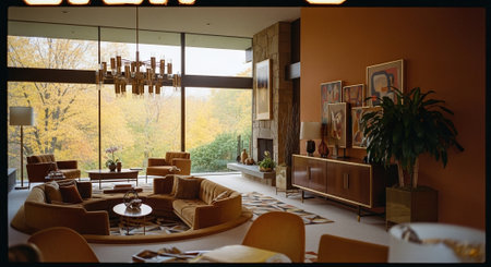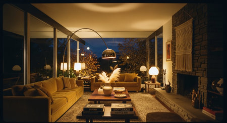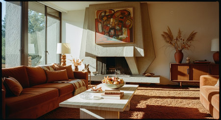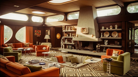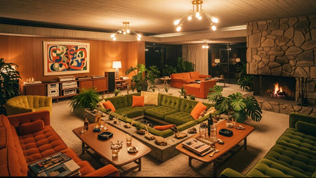 Explore a retro living room featuring vintage decor and warm colors, perfect for adding a touch of mid-century charm to any space. Cozy and inviting.