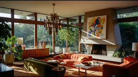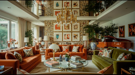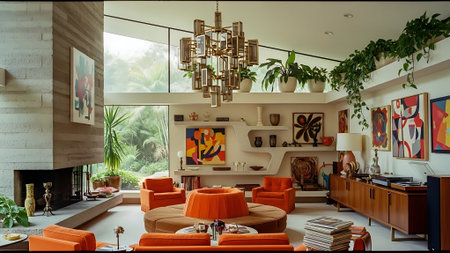 A stylish mid-century modern living room featuring orange sofas, a coffee table with books, a large artwork on the wall, and a potted plant