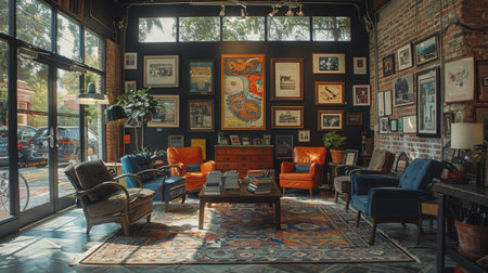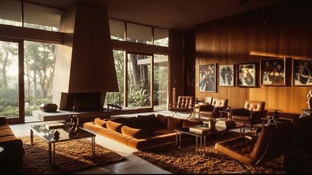 An interior showcases a living room with a vintage aesthetic. It features a sofa, chairs, a coffee table, and decorative elements. The scene is bathed in warm lighting, with soft textures and a focus on design. This image could be used for lifestyle, interior design, or commercial projects.