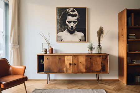 Panorama of stylish and vintage, wooden sideboard with decorations in bright room with modern art and black, round dining table