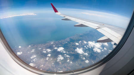 View from the porthole of the airplane window with blue sky and clouds
