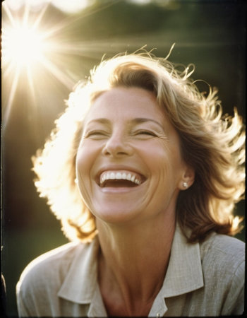 Create a vibrant portrait of a joyful person with an authentic smile, embodying warmth, happiness, and friendship, Use lively tones, pure whites, and clear daylight to emphasize depth and positivity.