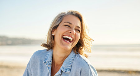 Joyful woman with light hair in denim jacket smiles brightly on beach, surrounded by ocean waves and soft sunlight, embodying happiness and relaxation, AI generated