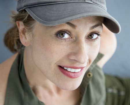 A woman stands smiling in front of a solid brown wall. She wears a mustard top over a green shirt. Her short hair and earrings are visible. The setting is bright and outdoor.